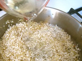 3. Add the rice and stir well to coat it with oil. Optionally add the white wine and stir until the rice has absorbed most of the liquid. Then add two ladles of the warmed stock and once again stir until the rice has absorbed most of the liquid. Continue adding the stock gradually for 10 more minutes, over medium/low heat, stirring constantly.