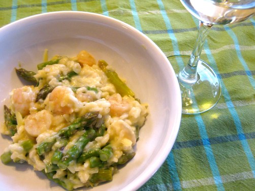 I had attempted many recipes according to Linda, but probably none in the past five years. And I had never made the “Asparagus and Lemon Risotto” until last night. The spring-like flavors were appealing for a warm balmy evening (the standing over the hot stove to stir the rice for 20 minutes was not). I basically stuck to Linda’s recipe other than de-vegetarianizing it by adding shrimp, and livening it up with a little white wine, but I suspect it still would have been pretty awesome without. And the goat cheese! The goat cheese mixed in at the end makes the whole dish extra creamy and decadent.