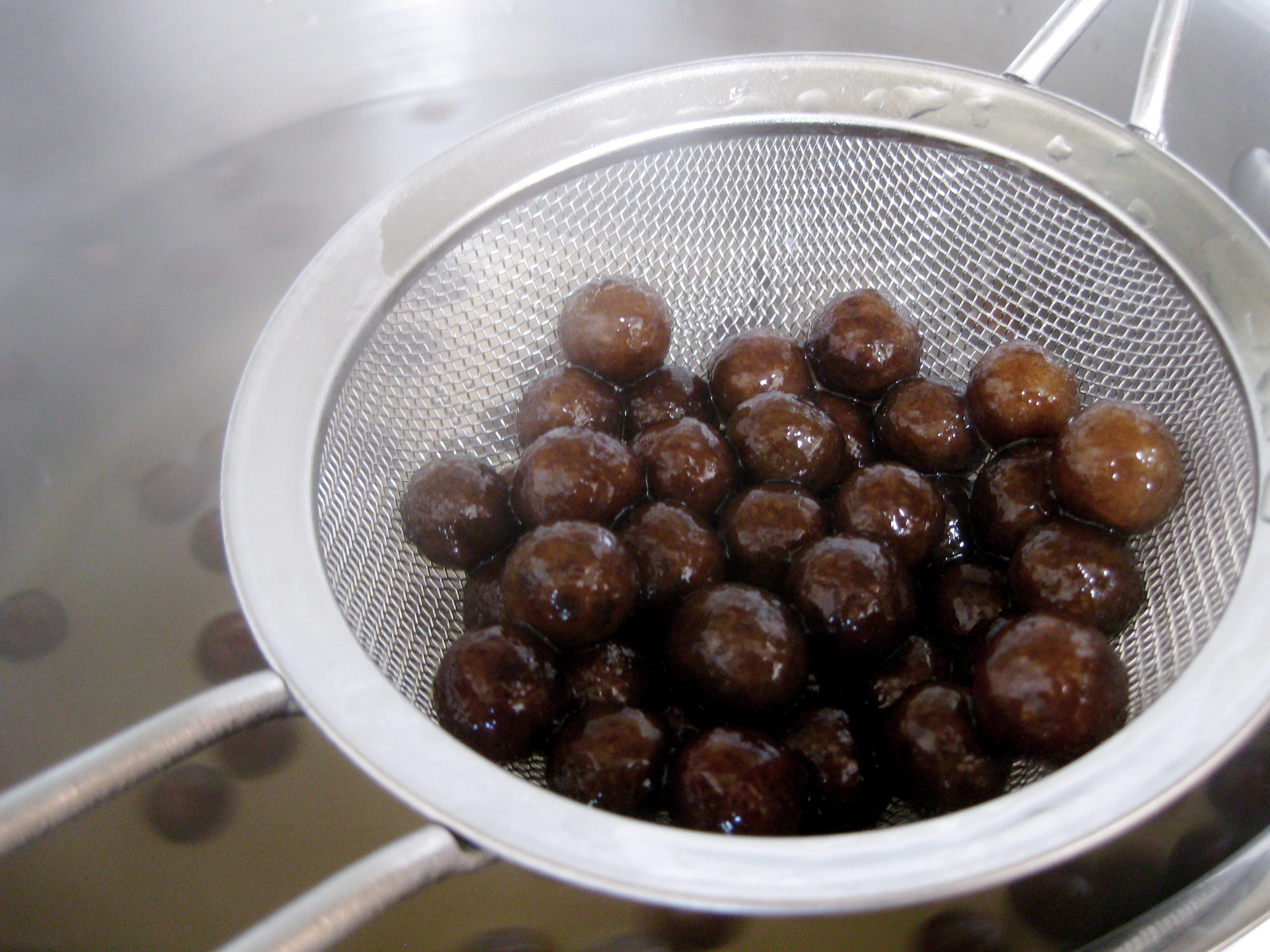 4. Stir well to mix the condensed milk into the tea. Add the boba last, several spoonfuls per glass of tea, and serve chilled with a straw. (There are thick straws designed specifically for slurping up tapioca pearls, but with a little suction, you can still use regular straws to spear each tapioca bubble.)