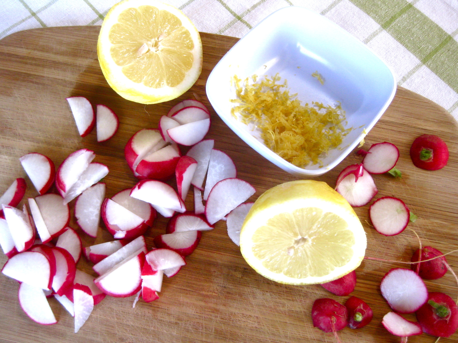 Yes, radishes. Do radishes mixed in with kale and lemon sound strange? The idea occurred to me because 1) I had radishes in the fridge to use up, and 2) This recipe starts out with quite a bit of butter, and butter helps to mellow the spicy pungency of radishes. In fact, butter makes radishes taste mild yet still crispy and refreshing.