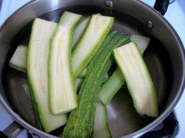 3. Slice the Costata Romanesca squash (or zucchinis) lengthwise into thin, even strips. Then bring a large, shallow pan of water to a simmer or low boil, and blanch the strips of squash for 2 minutes. Remove from the water, and press dry with paper towels.