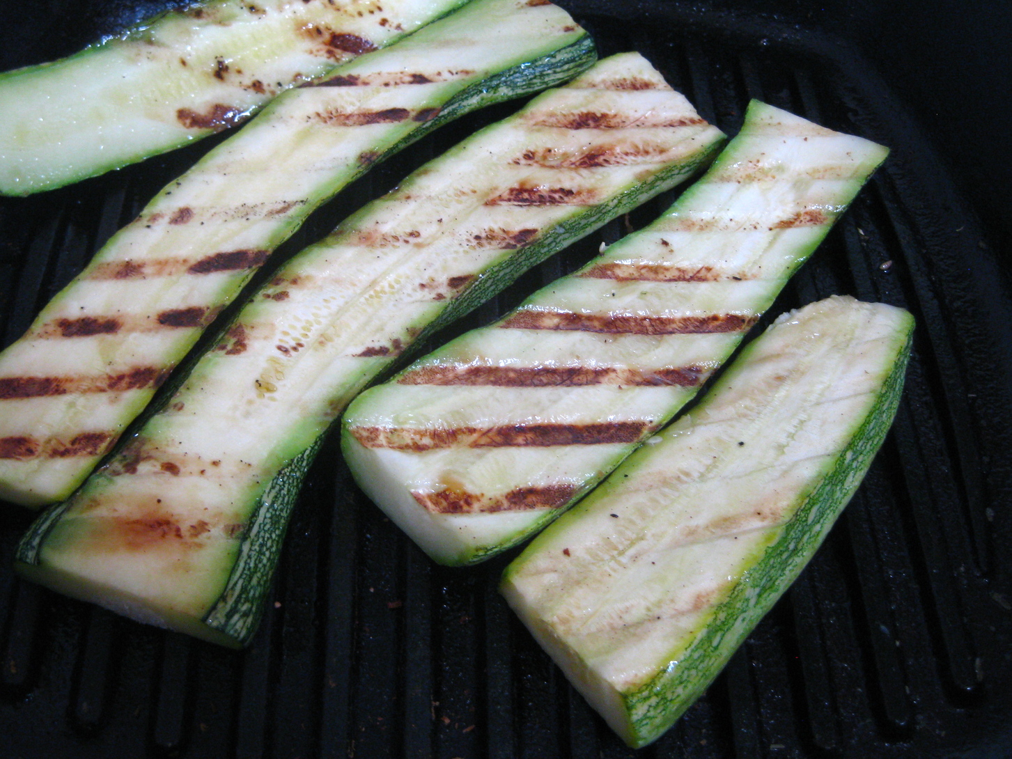 4. Heat a grill pan (or use an outdoor grill). Brush the squash strips with olive oil, then place them on the grill, over medium-high heat, for about 10 minutes on each side. (I started checking them after 7 minutes or so, but only turned them over once, so they developed nice grill marks.)