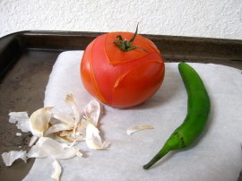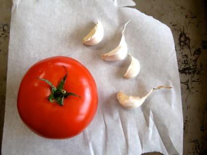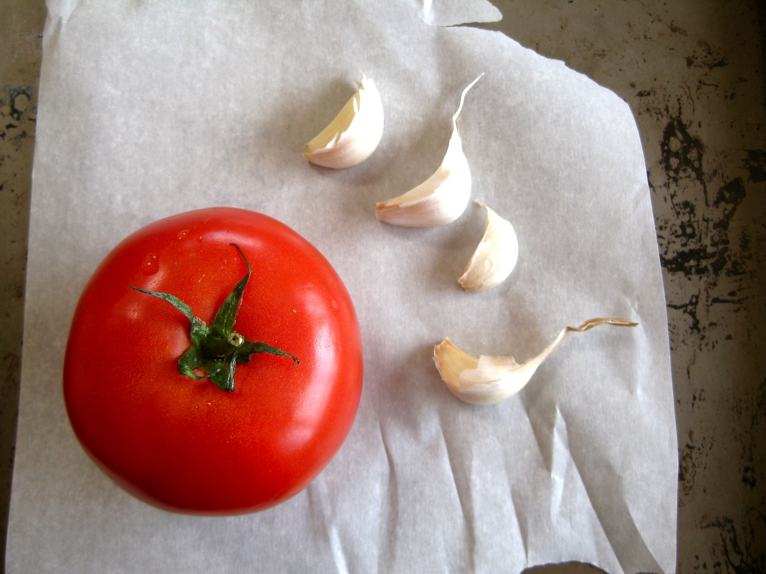 1. Char the tomato over a flame, or roast in the oven, along with the garlic, at 350 degrees for 15-20 minutes. Let the tomato cool, then peel and dice it. Peel the roasted garlic.