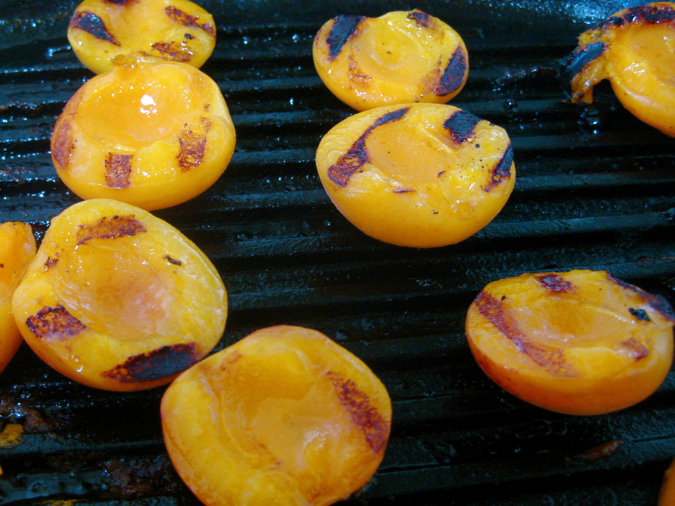 1. Light a grill or pre-heat a grill pan over medium-high heat. Brush the apricots with olive oil, and season with salt and pepper. Grill cut side down, just until lightly charred (3-5 minutes). Remove and let cool.