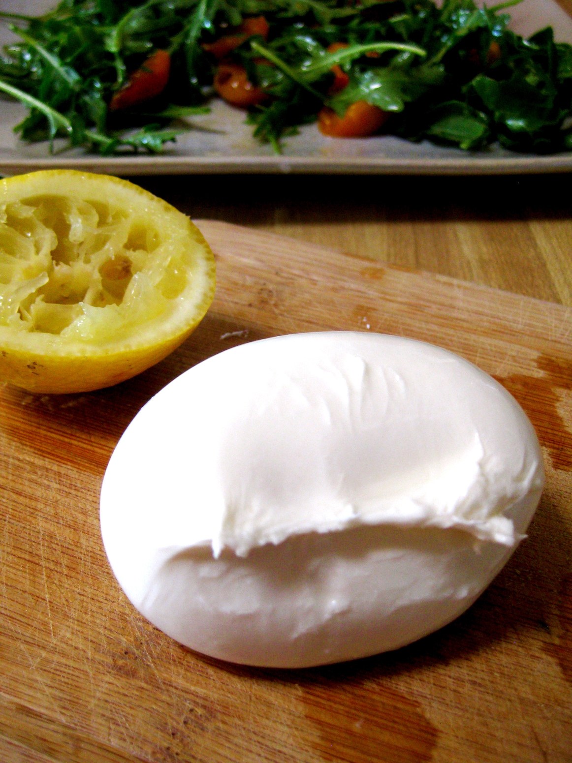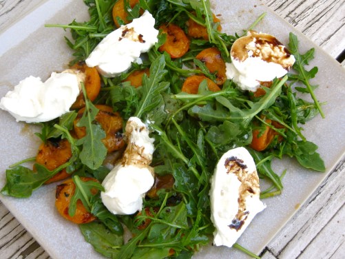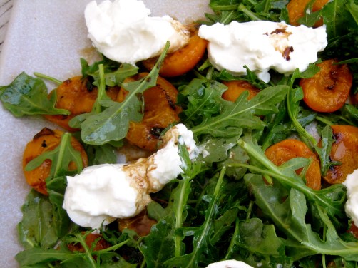 Arugula with fruit is one of my favorite combinations–love the peppery spice of the leaves with the sweetness of the fruit, and I’ll bet apricots were extra good with it. But the burrata? that just puts this over the edge. Amazing stuff.