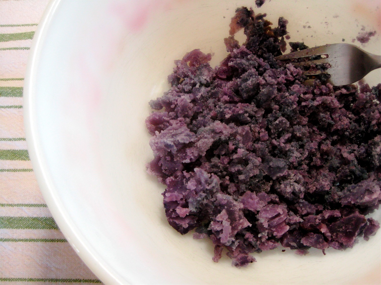 3. “Rice” the potatoes with a fork or a potato masher. (In her cookbook, Deborah Madison specifies that a food mill or potato ricer be used so that the potatoes remain “light and fluffy.” You can achieve this fluffiness by mashing each potato against the side of the bowl, instead of against any other potatoes.)