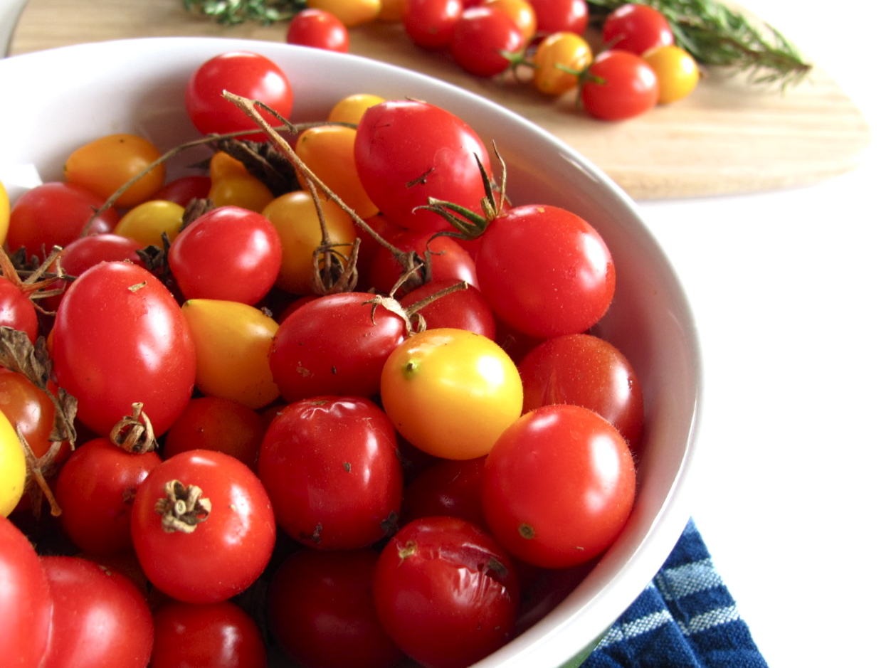 Although your roasting time will depend on the size of the tomatoes you use, I’ve taken to slow-roasting the tomatoes just a little less slowly– though at the same low temperature– in under two hours for cherry tomatoes instead of three, just to keep them extra juicy.