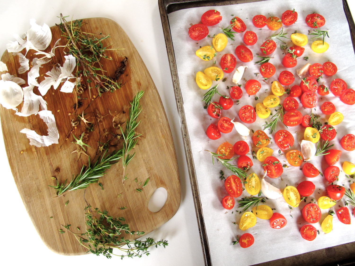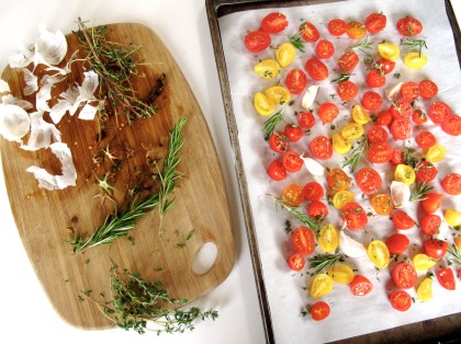 1. Pre-heat the oven to 225 degrees. Line two baking sheets with parchment paper, halve the tomatoes, and arrange them face-up on the baking sheets. Set the unpeeled cloves of garlic in among the tomatoes. Sprinkle with the fresh herbs and drizzle generously with olive oil.