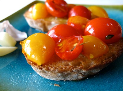 This quick and easy (you know, after the slow-roasting…) bruschetta is a favorite and a crowd-pleaser. My other favorite excuse to demolish a handful of these little goodies is to scatter them over a salad of mixed greens and sprinkle on a few spoonfuls of feta cheese.