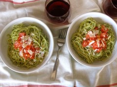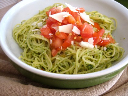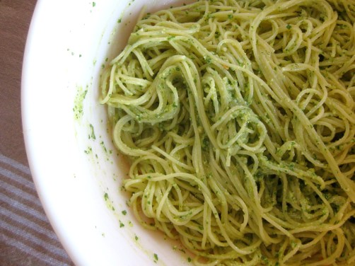 Any pasta can serve as the medium here, whether short or long. (I actually like pesto best with a short curly pasta, called gemelli.)