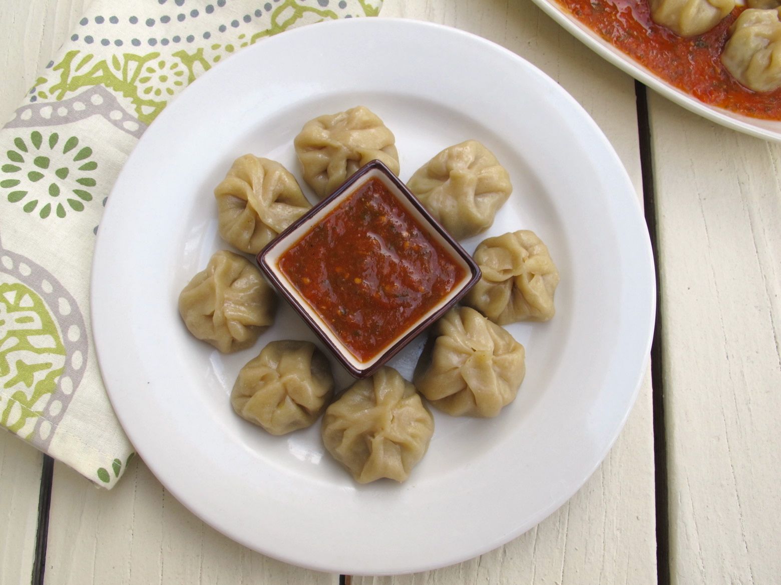 Nepali Momos (Steamed Dumplings) with Tomato Chutney