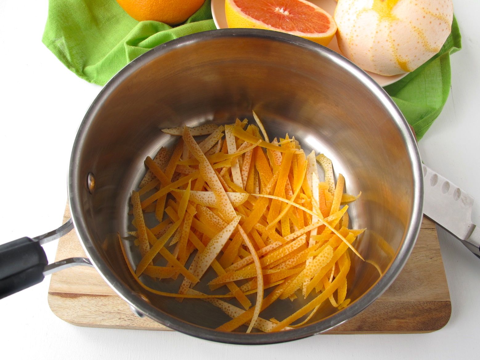 2. Place zest ribbons in a small saucepan and cover with water. Cover and bring to a boil, then uncover and boil 5 minutes. Drain away all of the liquid. Repeat this step once more.