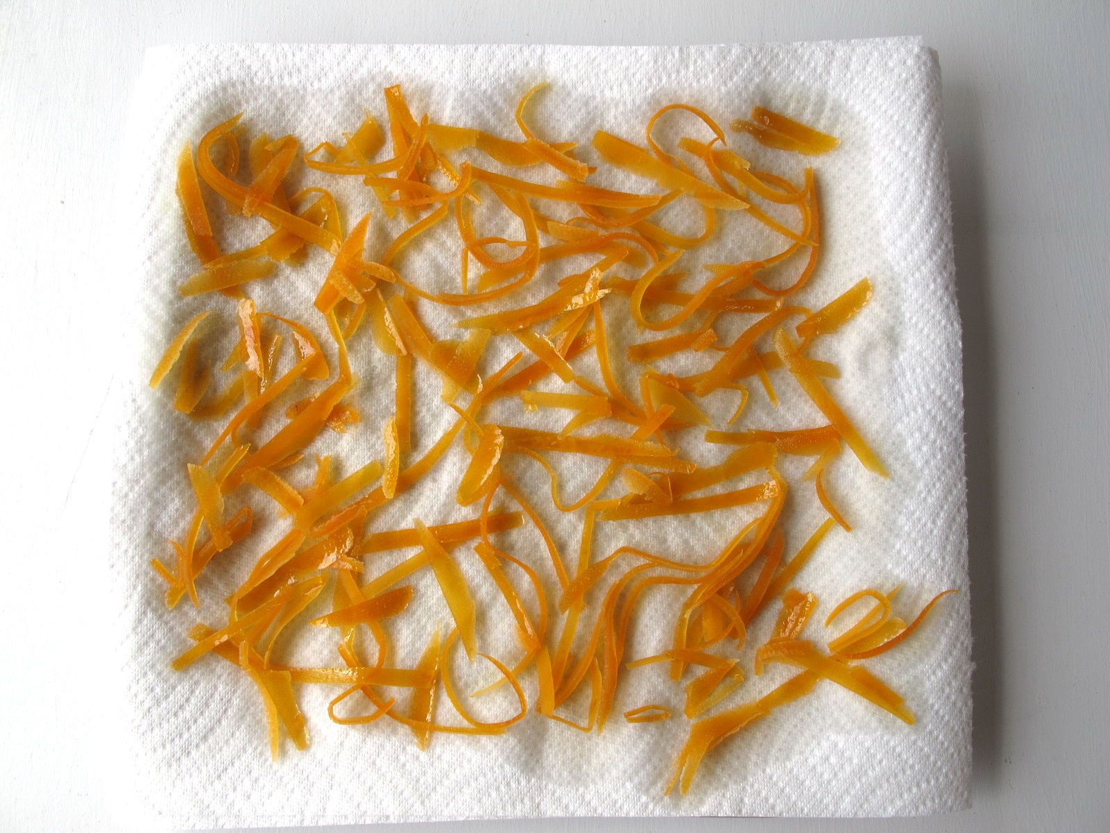 4. Using a slotted spoon or chopsticks, remove the zest from the liquid and let it drain and dry on a paper towel-lined plate. Enjoy right away, or optionally coat it with more sugar: Let dry for at least 1 hour—or up to 3 hours (for a nicer texture)—then transfer just some of the zest at a time to a small bowl, sprinkle with additional sugar, and toss the zest to coat it in sugar. Then transfer to a clean paper towel and let dry for another 1-2 hours. Store dried zest in an airtight container at room temperature for up to a week.