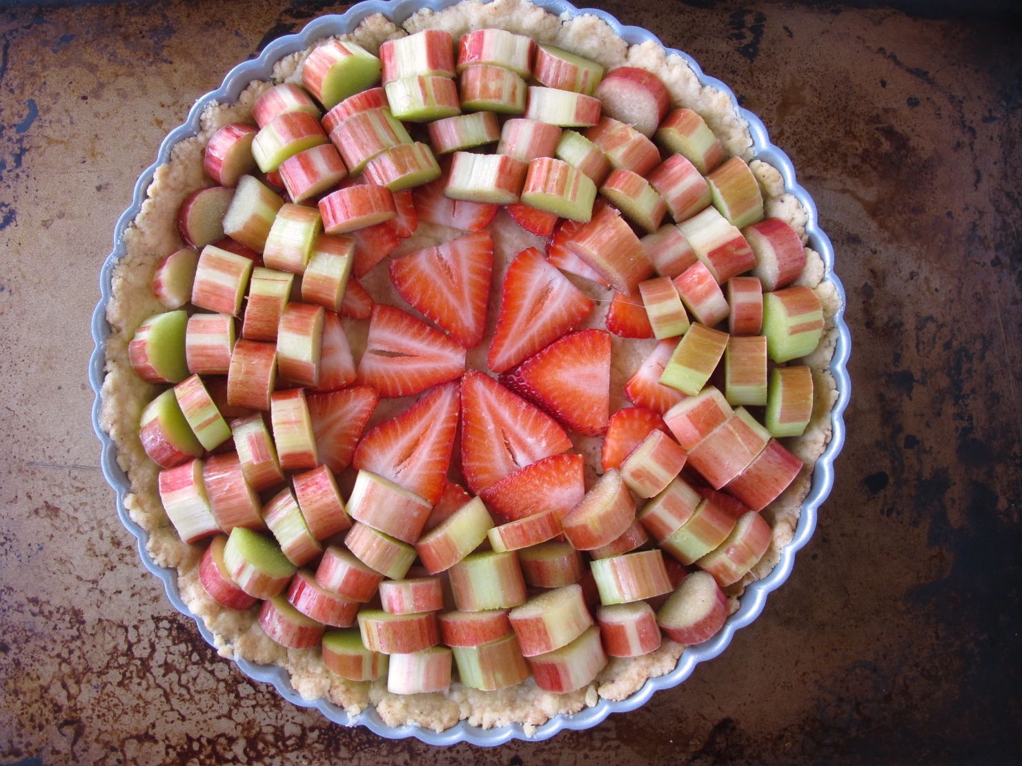 5. Once the crust has come out of the oven and cooled for at least 5 minutes, arrange the sliced strawberries evenly across the bottom of the tart crust, in a single layer. Then, starting from the outside, arrange the rhubarb tightly in concentric circles (with its cut surfaces facing to the sides, not up and down).