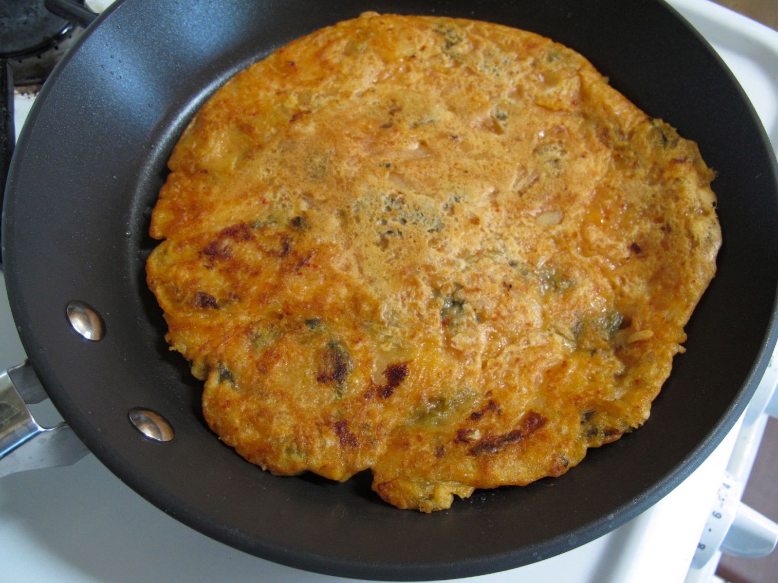 You’ll want the batter to seem quite thin and liquidy — like it’s really mostly the diced kimchi with just a little batter around it — that’s okay; it will all come together into a pancake.