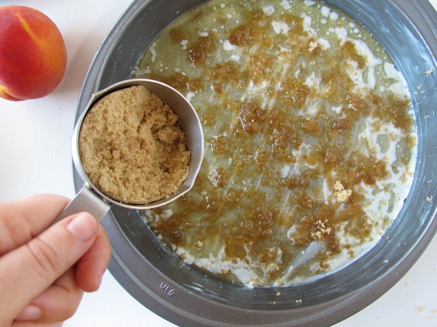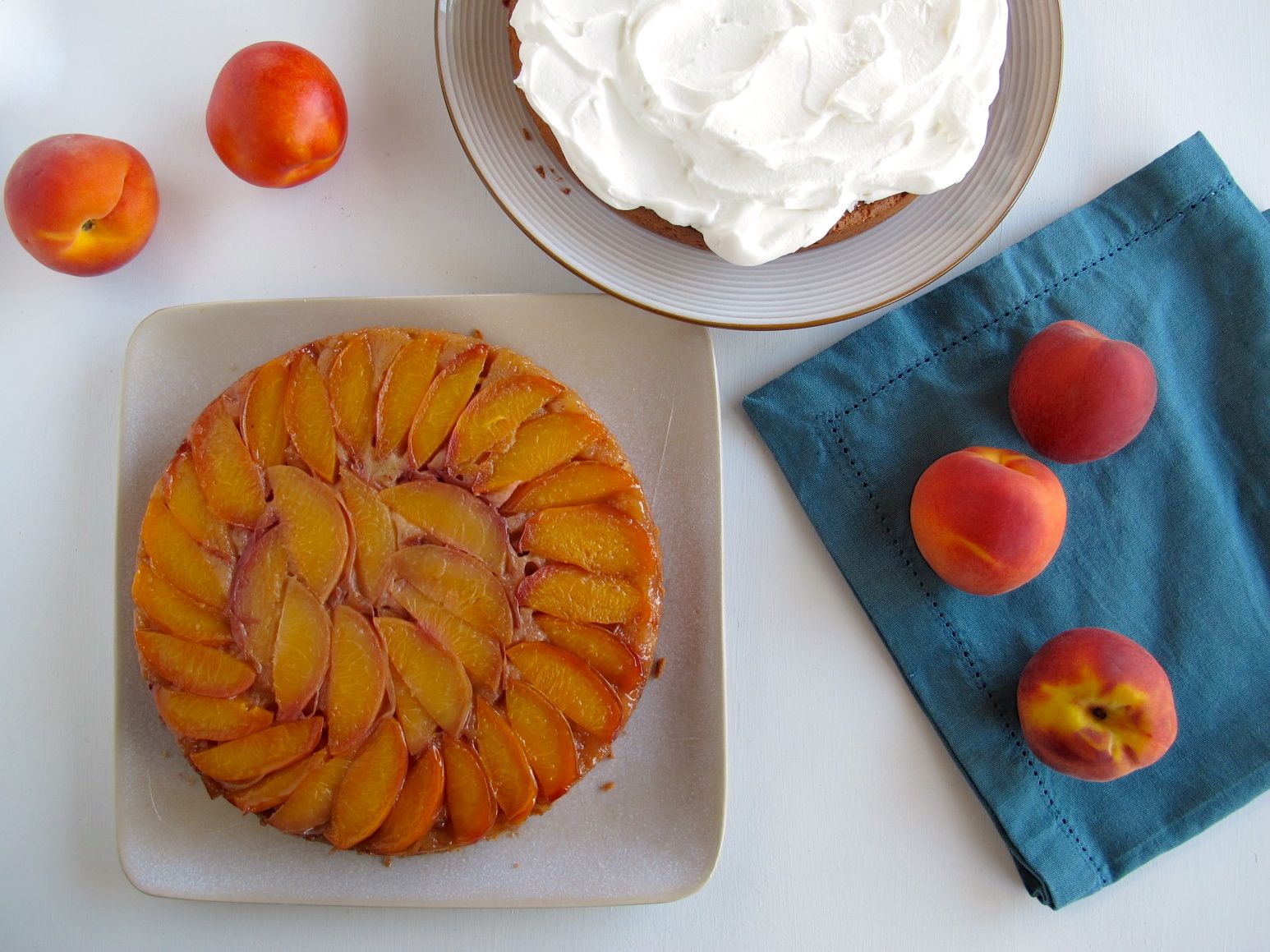 Of course you could also make TWO upside-down cakes and layer them, with whipped cream in between them and the prettier one on top — just follow the instructions for the top layer twice, and make sure you have enough ripe peaches and/or nectarines. Or you could make two basic bottom layers, double the whipped cream, and spread whipped cream in the middle and over the top, setting fresh fruit into each layer. I love the sweetness of the baked fruit, though — it seeps into the cake along with the buttery brown sugar upside-down-cake topping.