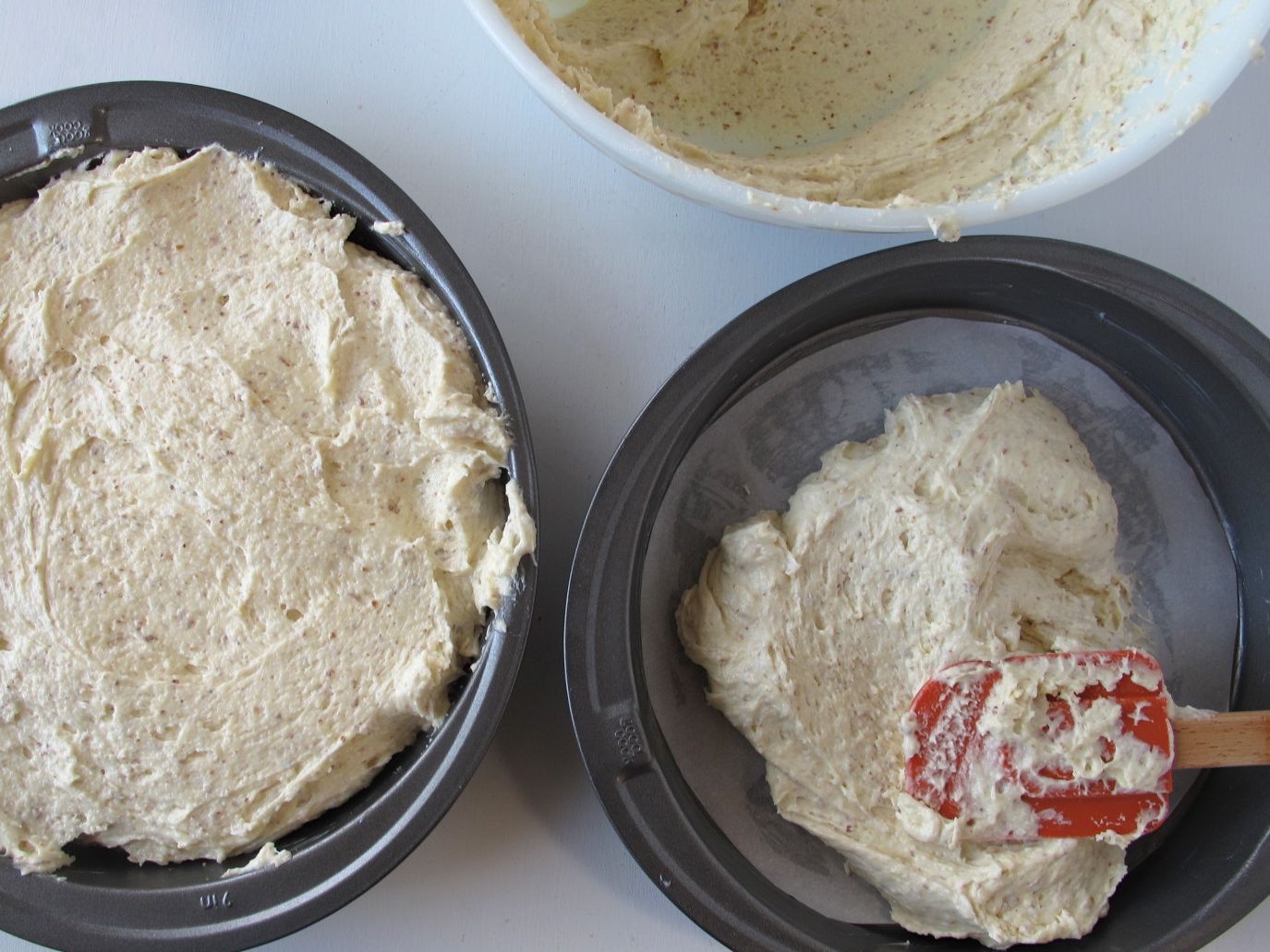 1. Arrange a rack in the center of the oven and pre-heat to 300 degrees. Use butter to grease the bottom and sides of each 9″ cake pan, then set the parchment circles into the pans. In a medium bowl, whisk together the flour, ground almonds, baking powder, and salt, then set aside.