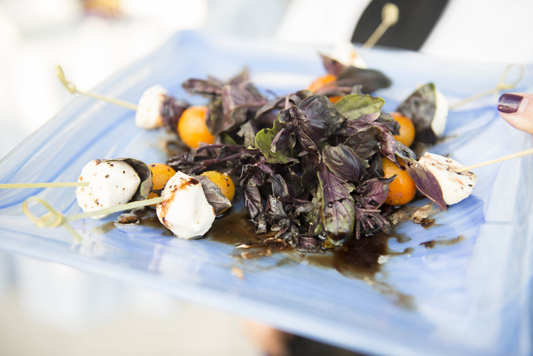 Caprese skewers with heirloom cherry tomatoes, mozzarella, and basil.