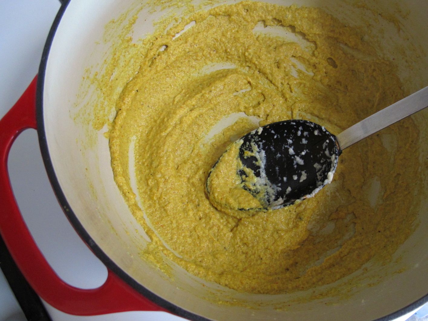 2. In a large pot or deep pan, heat the butter or ghee to melt it, then add the garlic/ginger/onion mixture from the blender and cook, stirring frequently, over medium-high heat for about 5 minutes, or until much of the liquid has evaporated and the paste is fragrant. (Don’t wash the blender yet!)