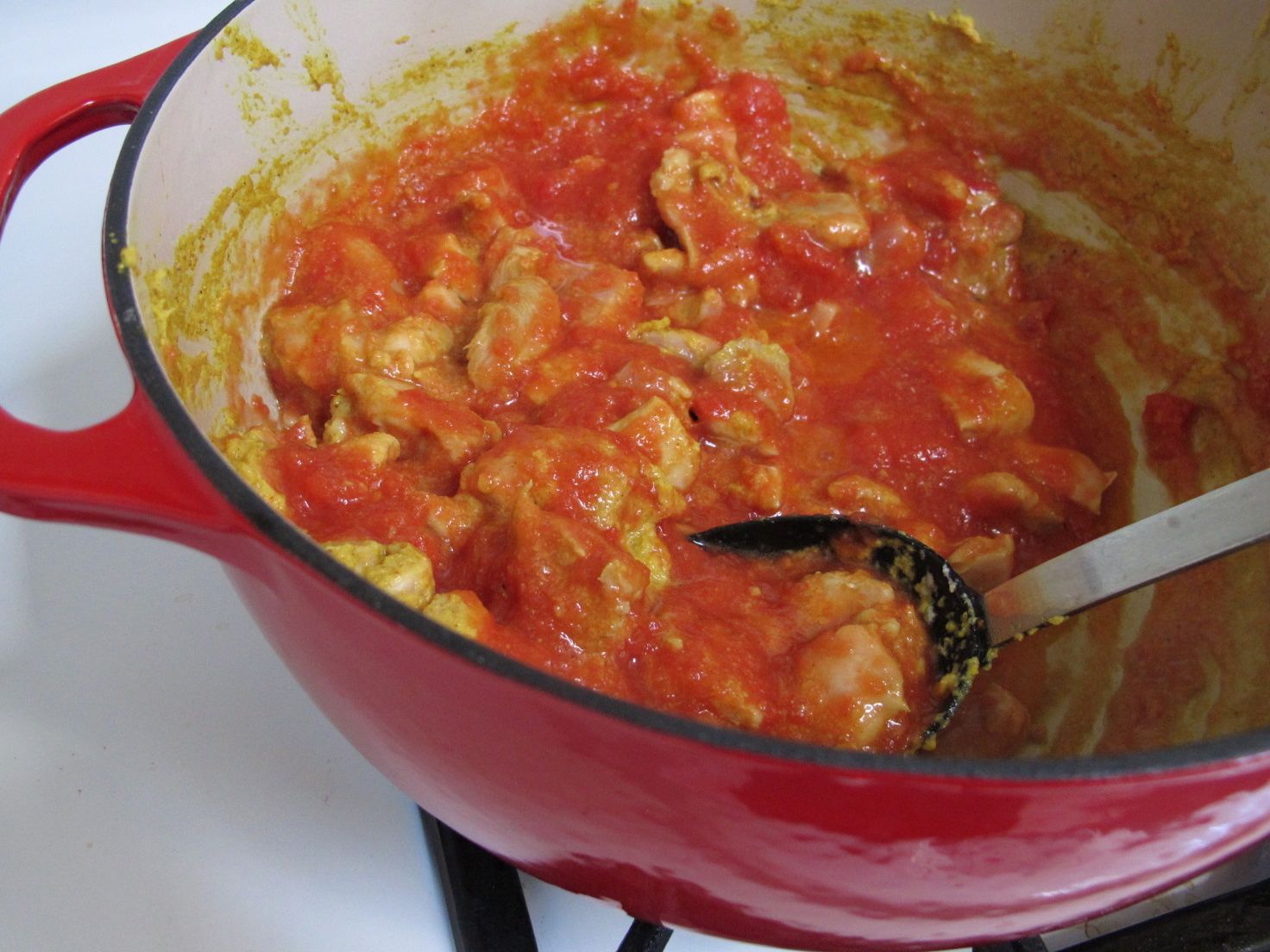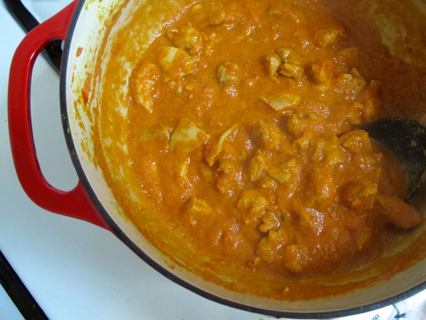 5. Once the chicken has cooked through, add the garam masala, give it a stir, then taste the curry sauce and adjust the seasoning as needed, adding more salt/chili powder/etc. if necessary. Then turn the heat down to low, and stir in the rest of the coconut milk (use the entire can for a creamier orange curry, or only about half a can total for a more tomato-y curry, with just a little richness). Cook for another 2-3 minutes, then remove from the heat.