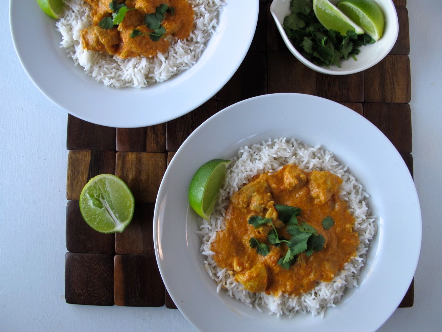The curry sauce gets its body from crushed tomatoes, and its creaminess from coconut milk. The coconut milk makes the curry a lot lighter than if you were to add heavy cream (which is something I rarely stock in my kitchen), but I make up for that by using some butter or ghee, for a little hint of the richness you’d get in a butter chicken curry.