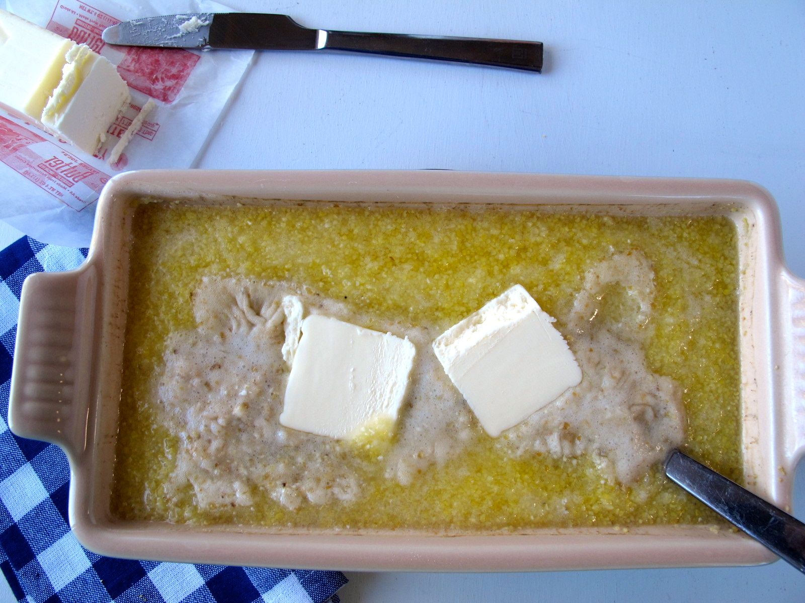 2. Remove from the oven and stir the butter into the polenta until it melts completely. Then return to the oven for another 20-25 minutes, or until the top looks dry and the center seems pretty firm when you tap the side of the pan.