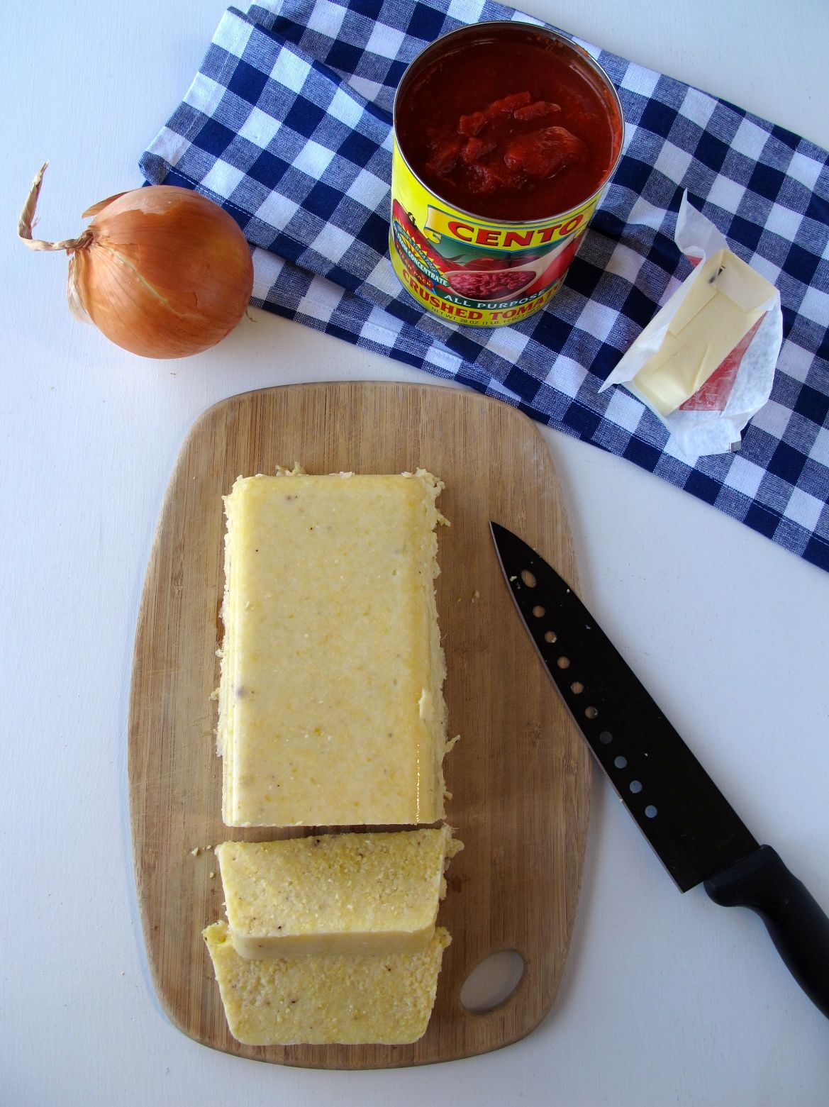 Plus, I like that you cook it, or rather bake it in this case, ahead of time — like a day or two ahead of time — so it seems like you’ve already done half the work on the night of. Not that it’s very much work in the first place: you can simply bake the polenta directly in a loaf pan, let it cool a bit, and then stick it in the fridge.