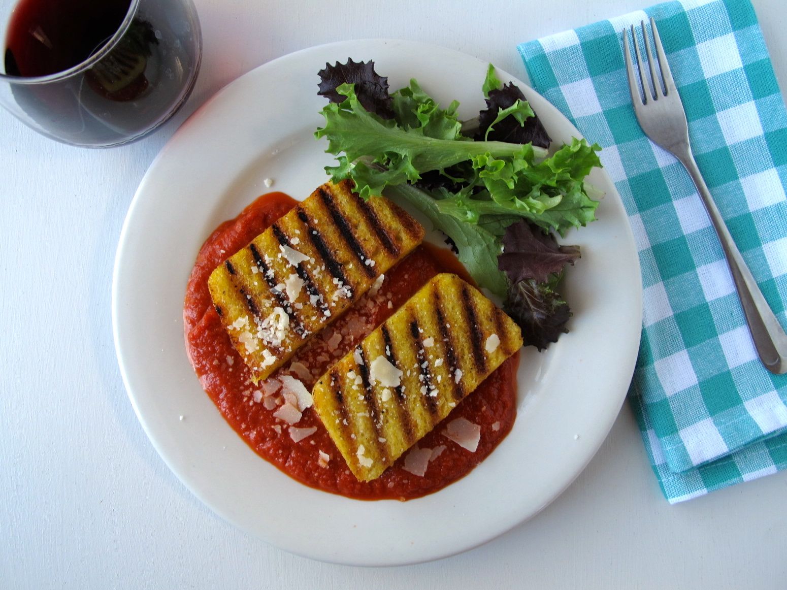 In one episode the host references the “tubes” of pre-cooked polenta, which I guess were just starting to appear in mainstream grocery stores when the show aired in the 80s, but he says it’s much nicer to make your own, and suggests pouring stovetop-cooked polenta into a loaf pan to cool and solidify into a rectangular block. To me, this seemed like the perfect solution for an easy dinner of grilled (rectangular) slices of polenta, without leaning on the storebought stuff. (The rectangular slices would also let you line a casserole dish for polenta ‘lasagna’ better than the circular slices would, although that’s something I still haven’t tried.)