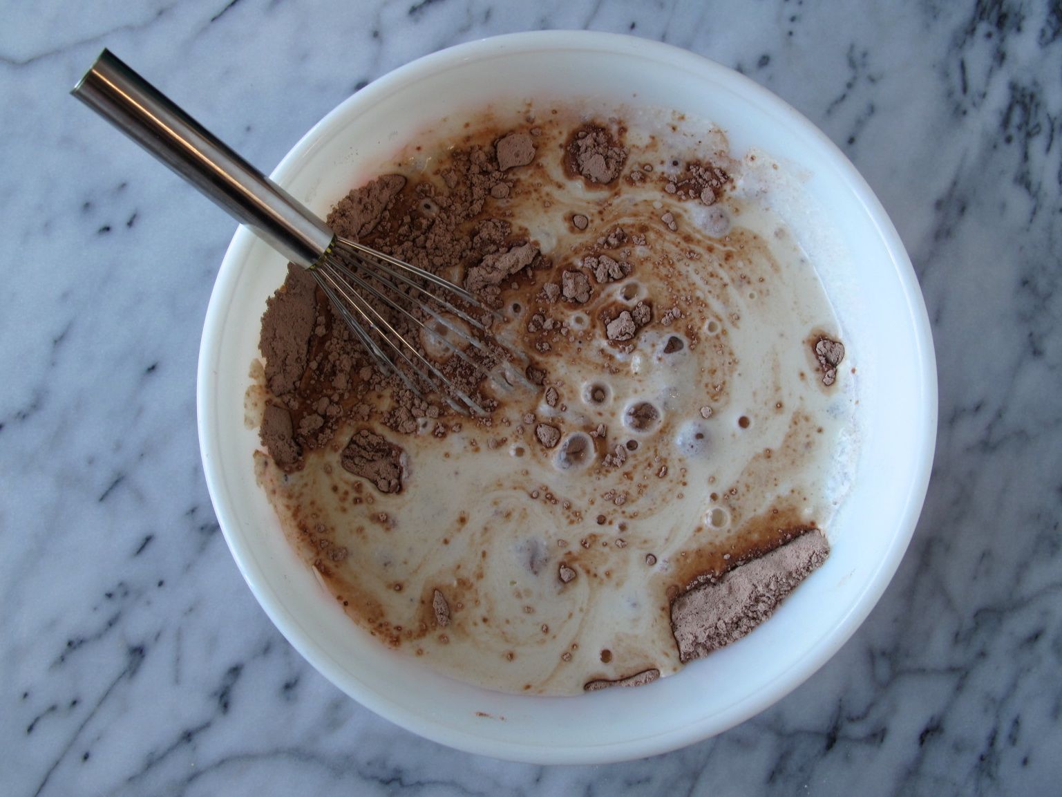 2. In a large bowl, combine the flour, cocoa powder, baking power, baking soda, and salt. Whisk together, then set aside.