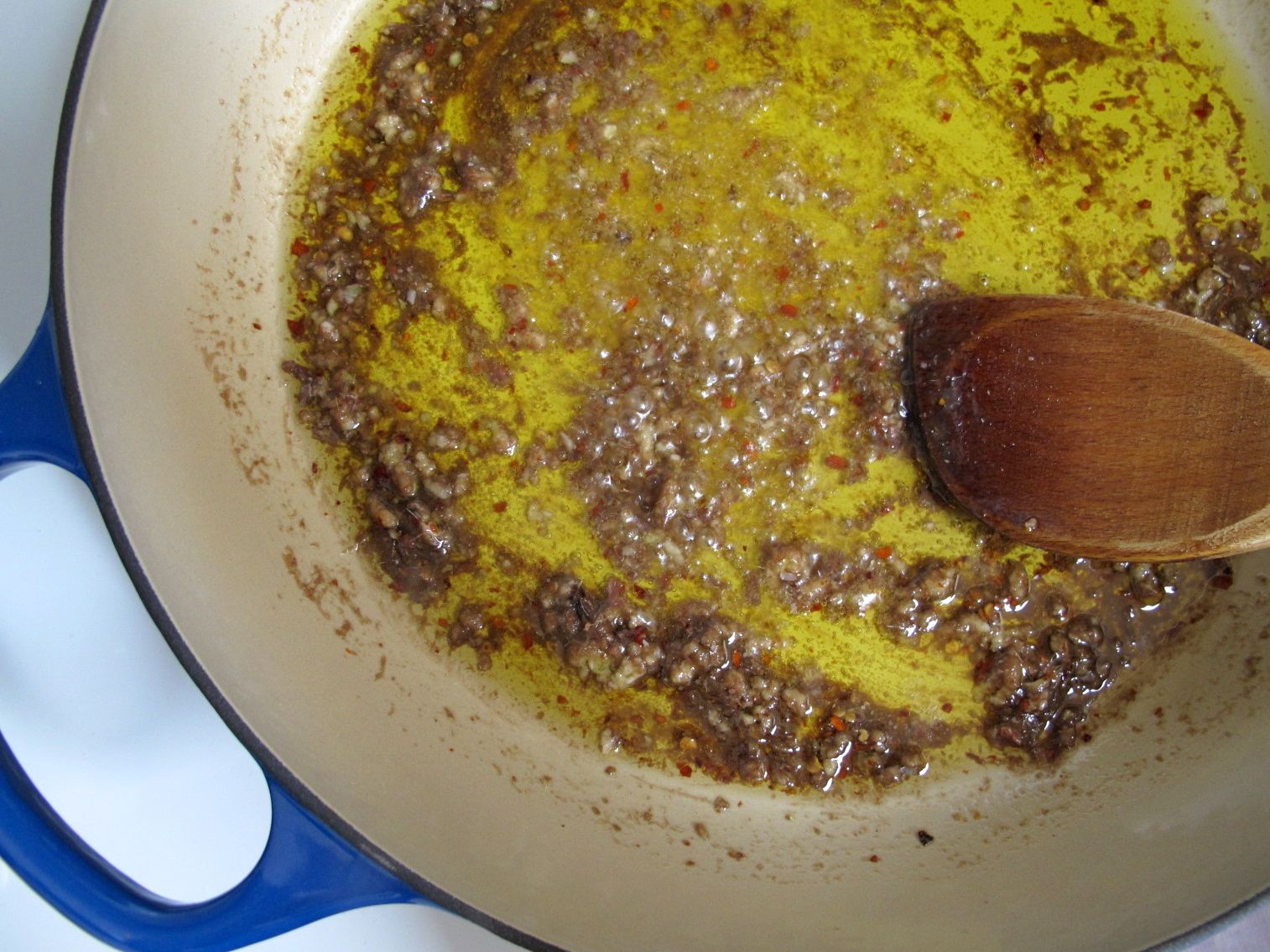 2. Meanwhile, in a wide sauté pan/braiser (or any pan that’s deeper than a typical frying pan), warm the oil over medium-low heat, then stir in the anchovies until they break apart and dissolve into the oil (2-3 minutes). Increase the heat to medium, then add the garlic, chili flakes, and sea salt, and let sizzle for another minute or two, stirring frequently — you want the garlic to sizzle until fragrant, but not burn. Stir in the chopped artichokes, and cook for 5-10 minutes, stirring occasionally, to coat them in the sauce. If this is all finished before the pasta is ready, lower or turn off the heat, but leave it on the burner.