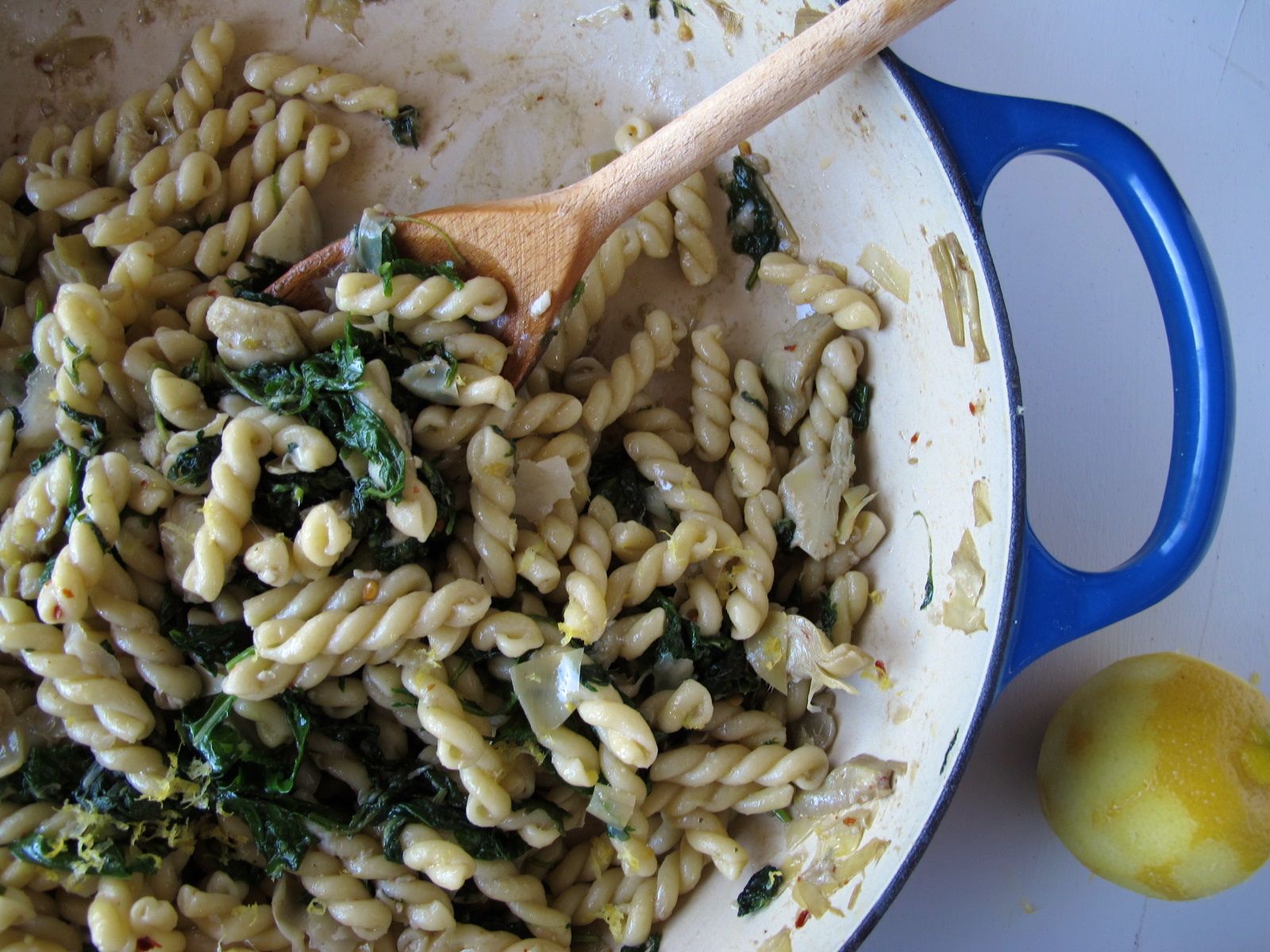 I love that the same wide pan I use to dissolve the anchovies into olive oil — and to layer on the flavors with the garlic, artichokes, and chili flakes — can be used to re-warm the cooked pasta and kale, as it soaks up the sauce with the help of a splash of pasta cooking water.