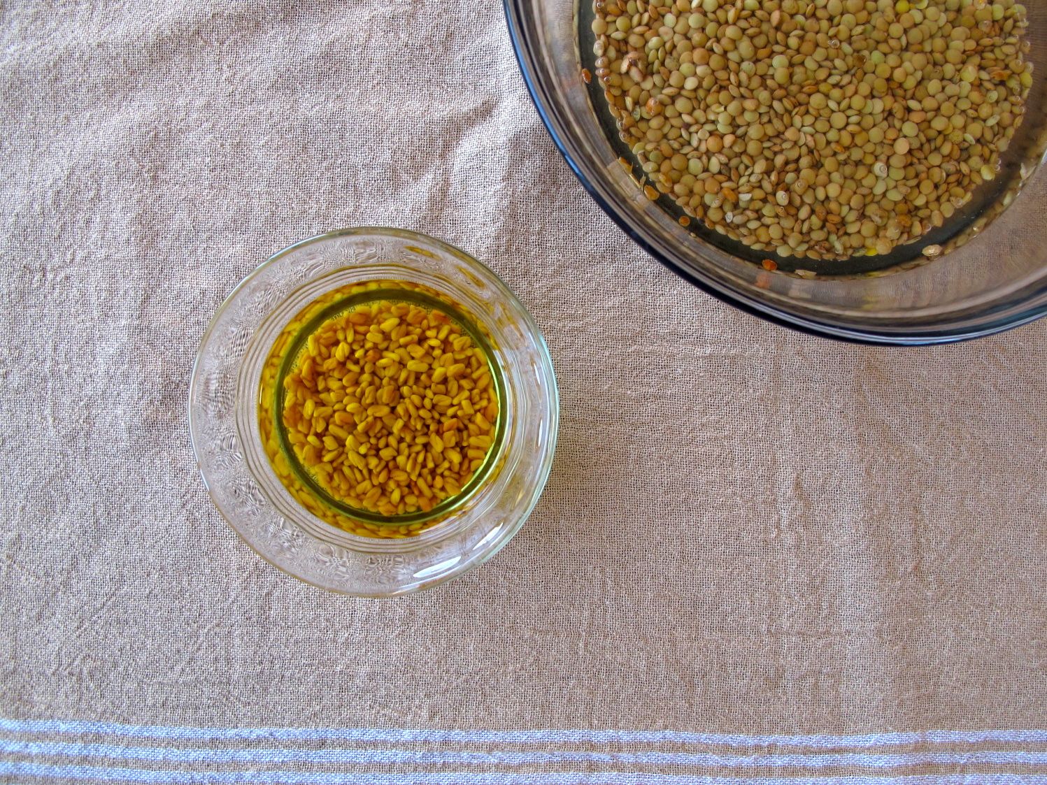 0. (Rinse and optionally soak the green lentils for 1-2 hours, then drain before using.) Soak the fenugreek seeds in boiling water (drain and pour over new boiling water several times) for 1 hour, or in room temperature water overnight. After the fenugreek seeds have soaked, drain them, and then grind them in a coffee grinder or a powerful blender (if you’re using a strong blender, add a little water to help them blend).