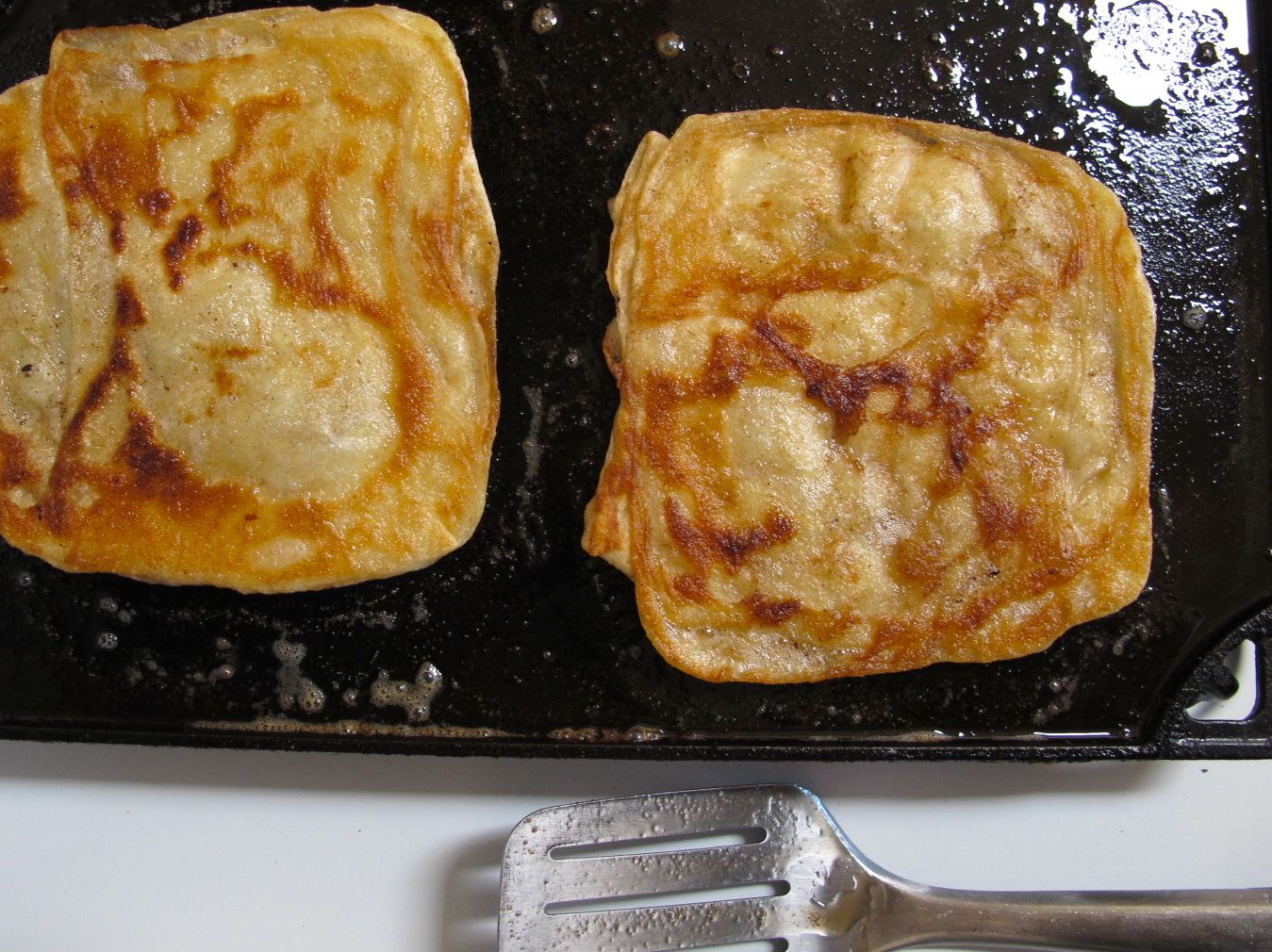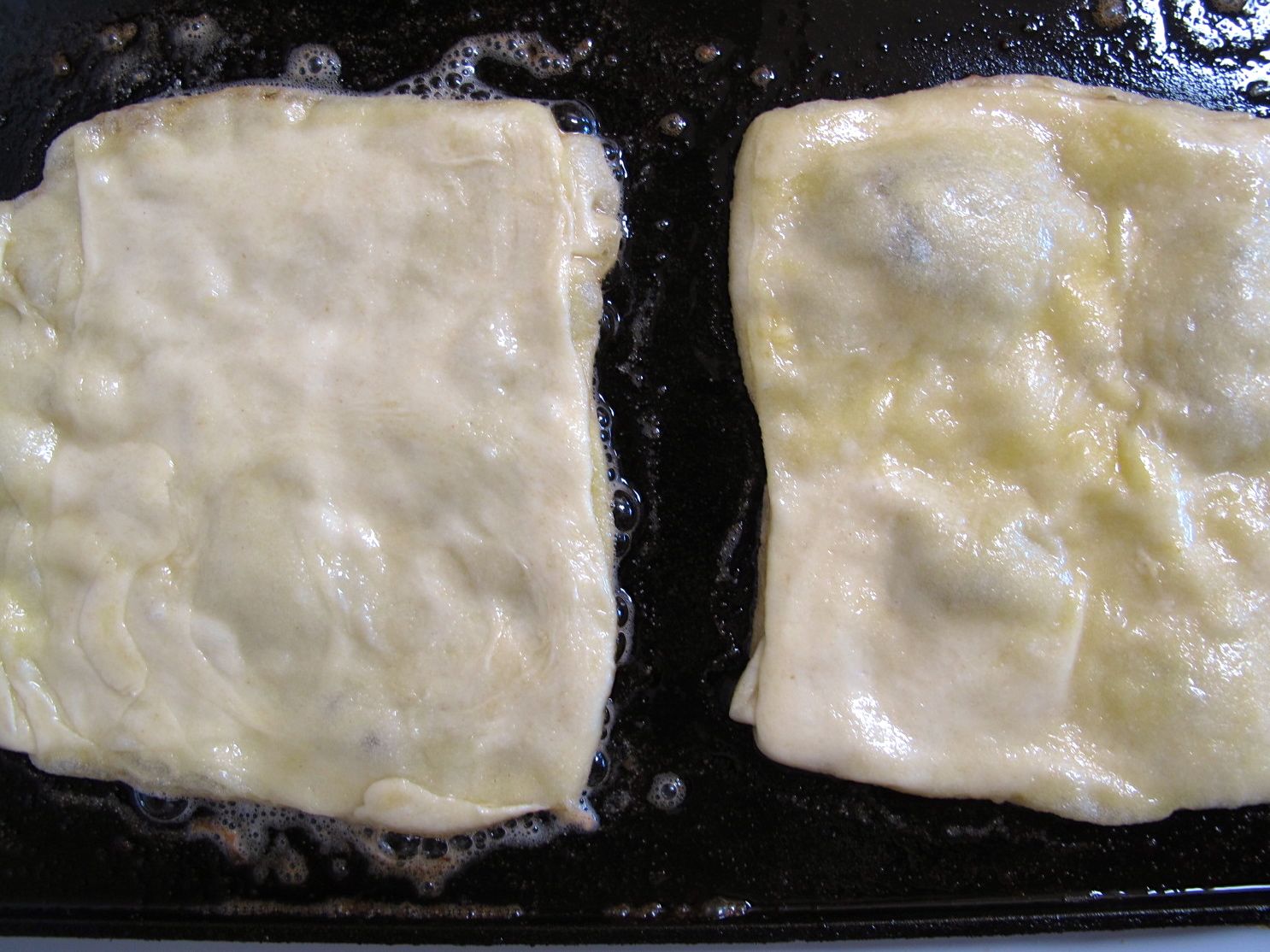 Square on the left flattened till doubled in size and ready for frying - Making MsemenFrying Msemen - Moroccan Flatbread