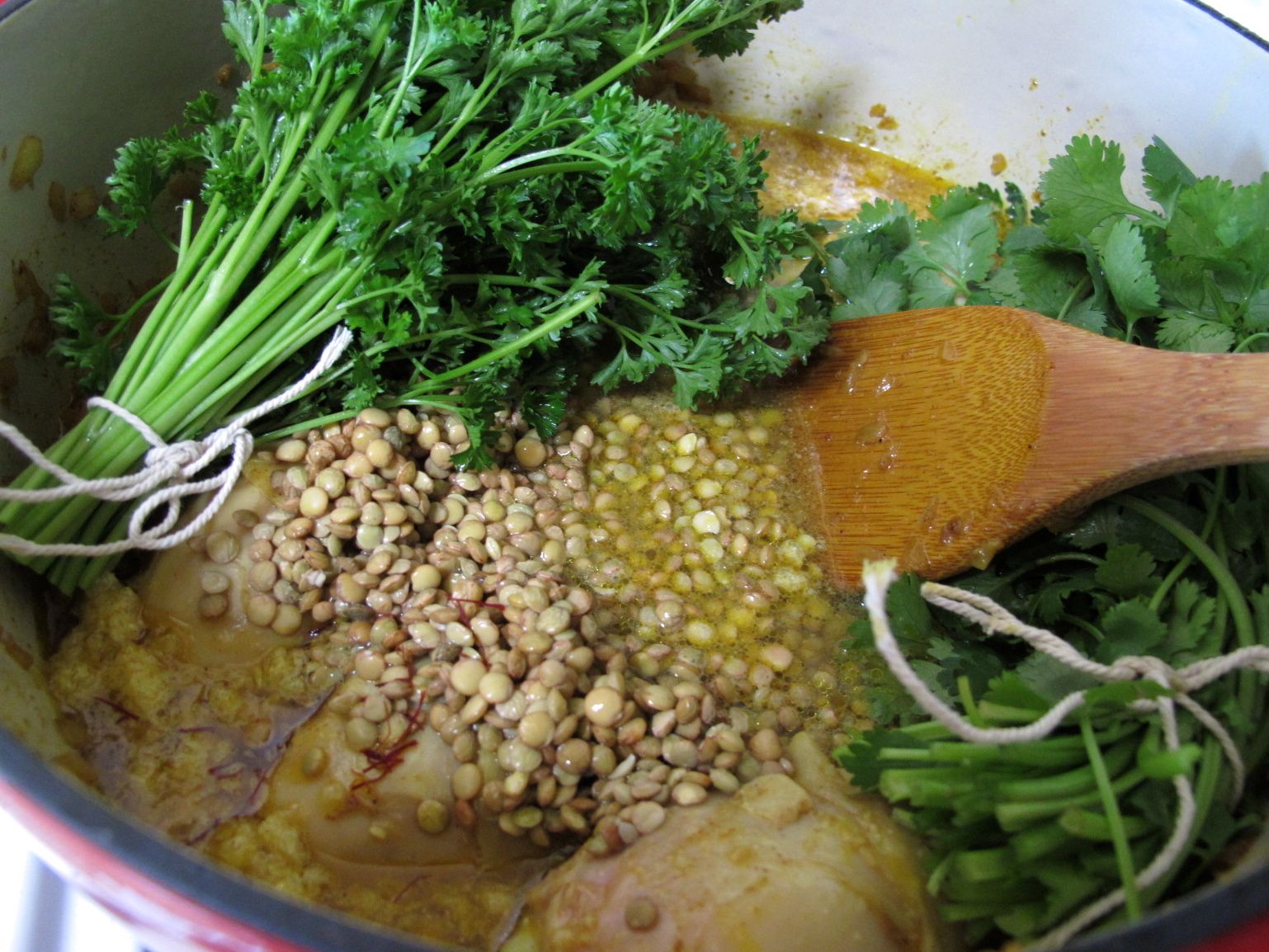3. Uncover and increase the heat back to medium. Pour over the 2 3/4 cups water, then add the (soaked and) drained lentils, the soaked, drained, and ground fenugreek, the bunch(es) of cilantro and/or parsley, the pinch of saffron, and the remaining 2 Tbsp. of olive oil. Cover and simmer for 30-35 minutes, stirring occasionally.