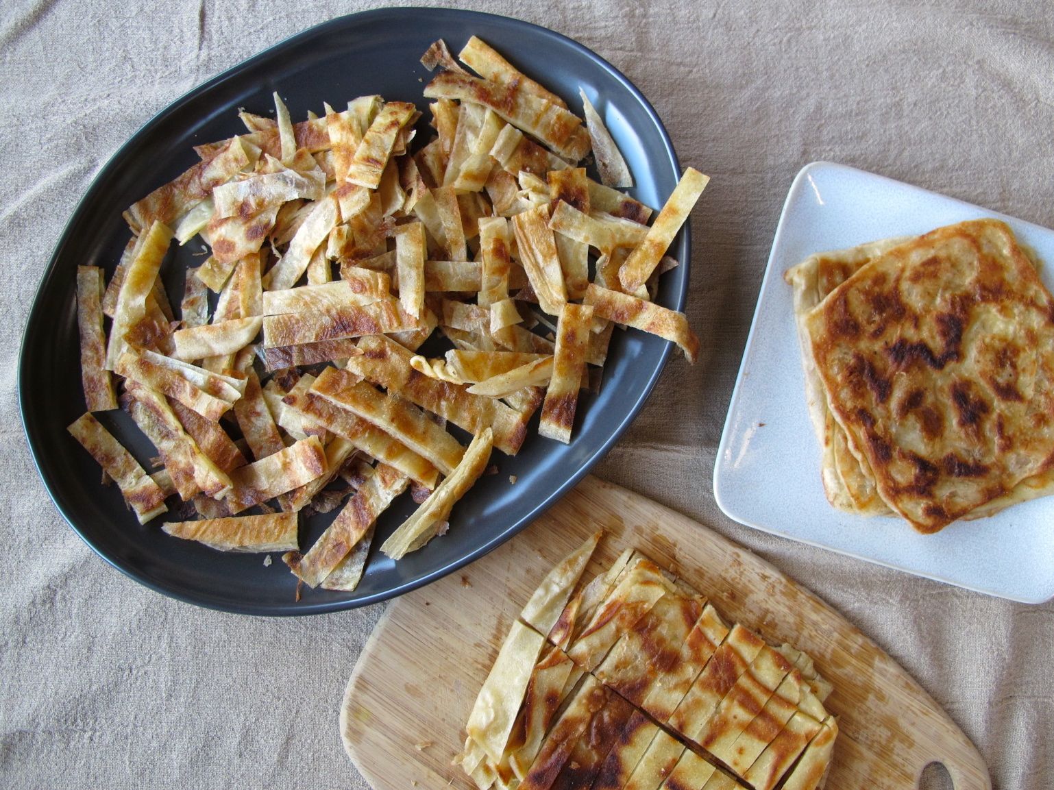 ~ 1 batch msemen (or 2 storebought frozen paratha), fried and sliced into strips, to serve