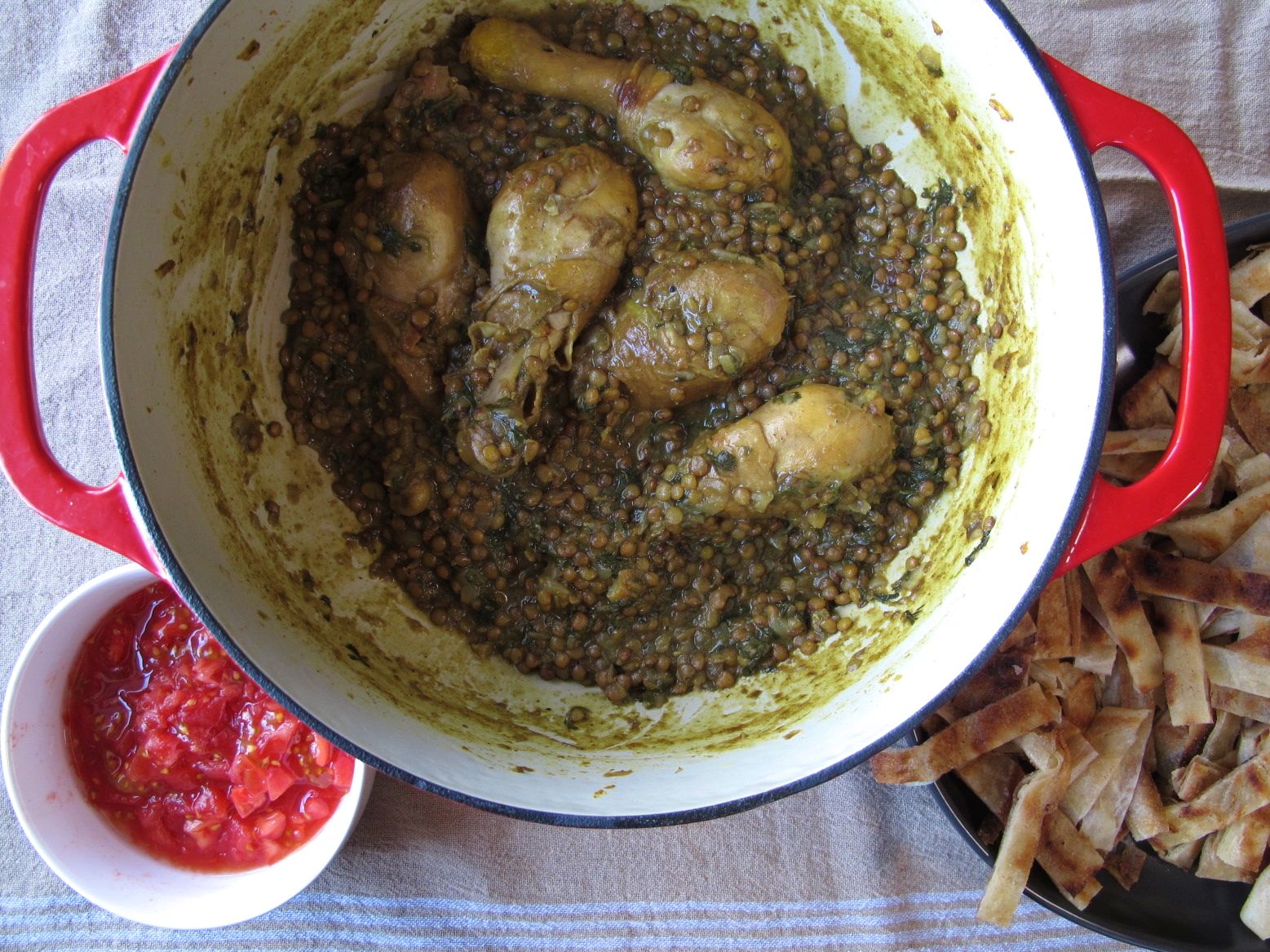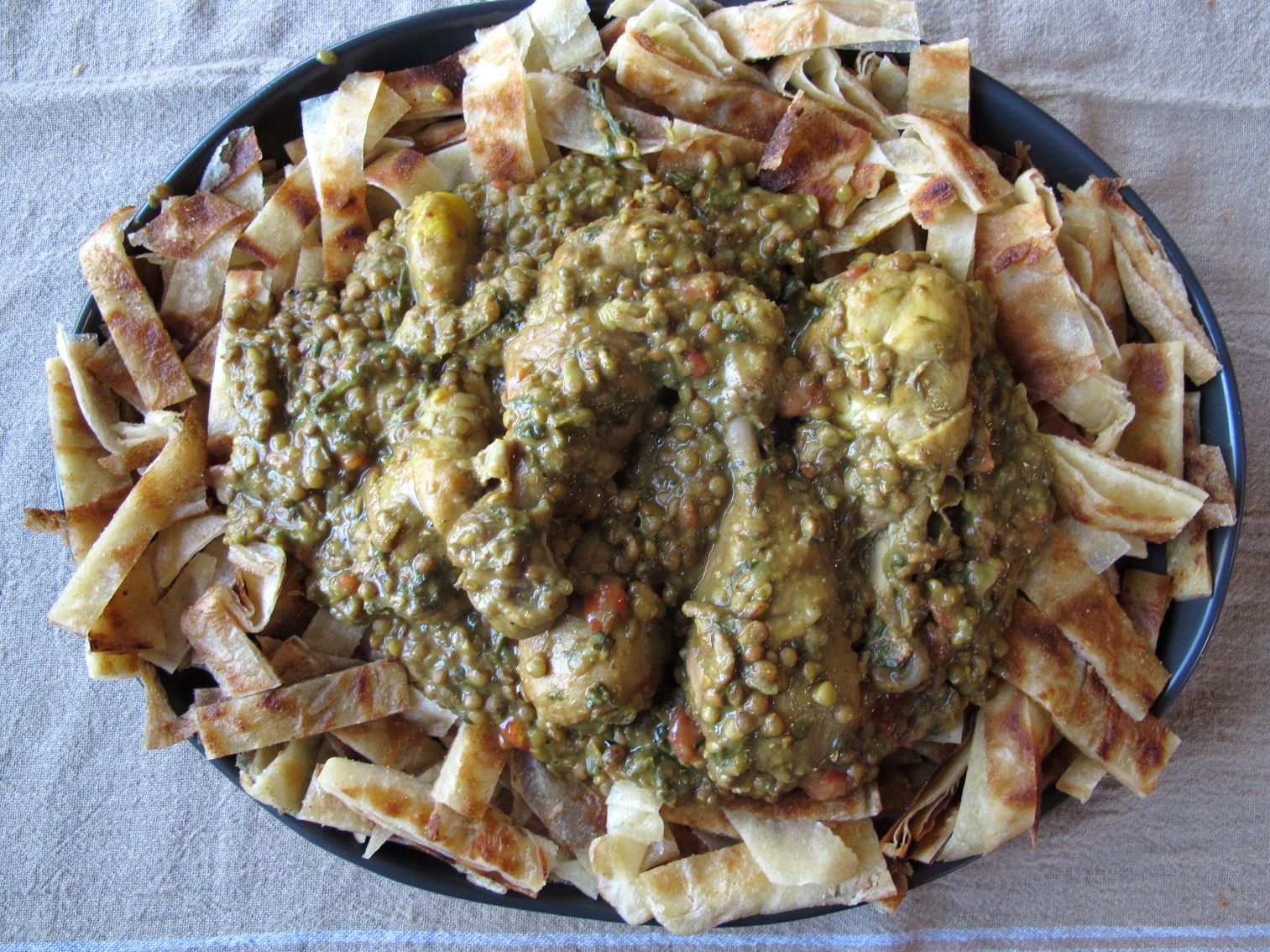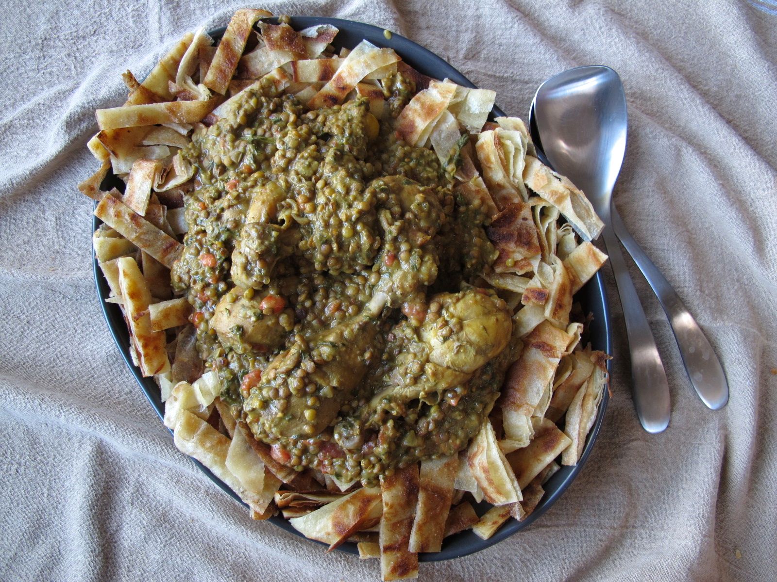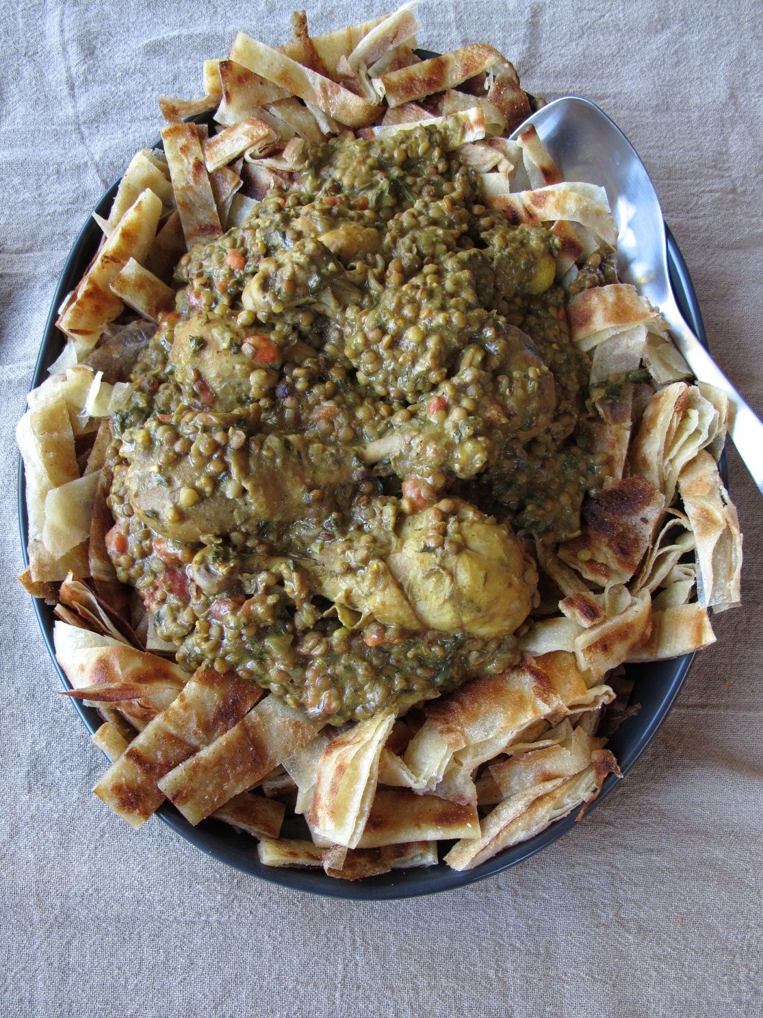 To serve: Arrange the sliced strips of fried msemen (or paratha) on a large serving platter (or in individual dishes), and plate the chicken and lentils over the strips of fried bread.