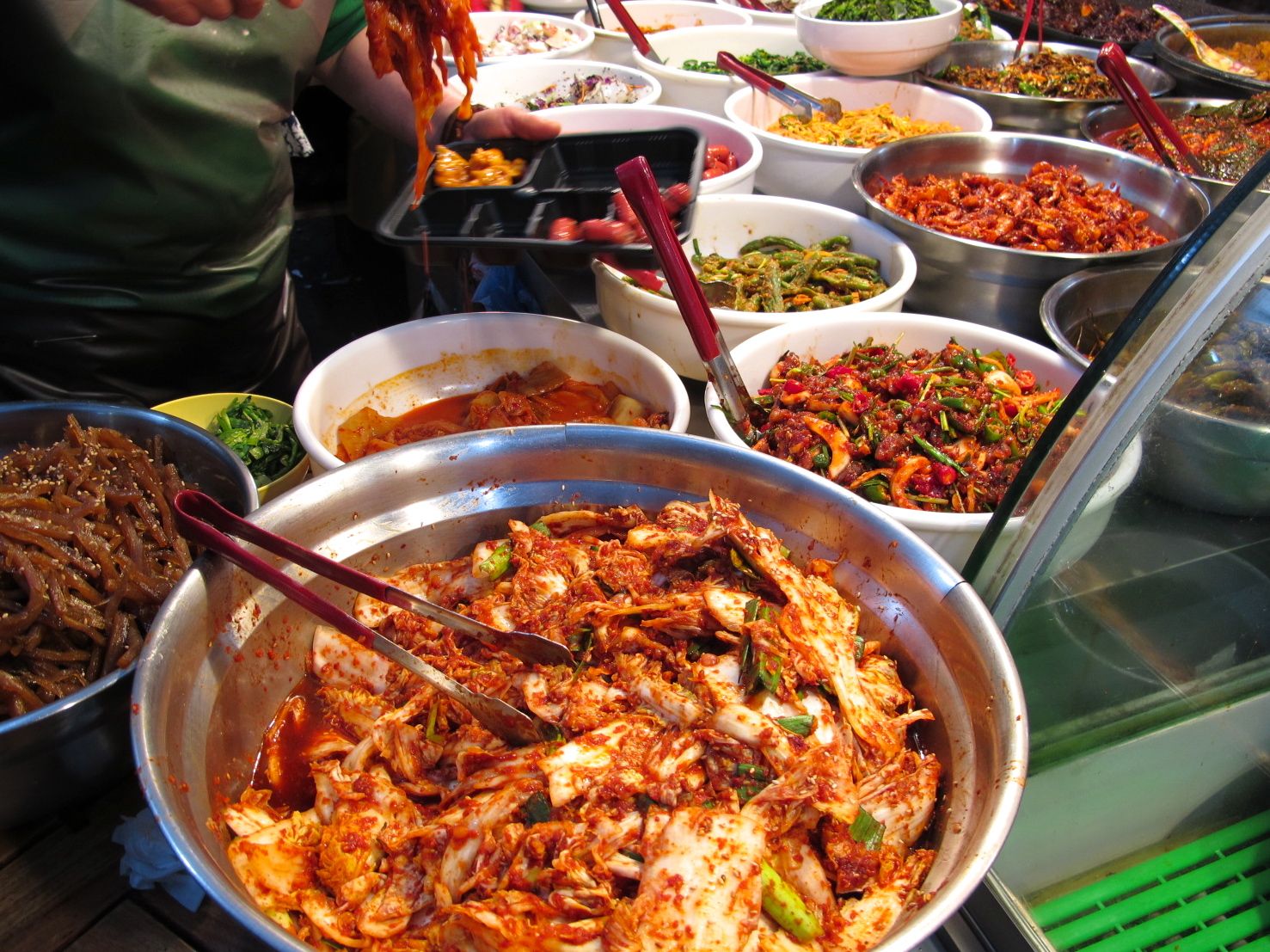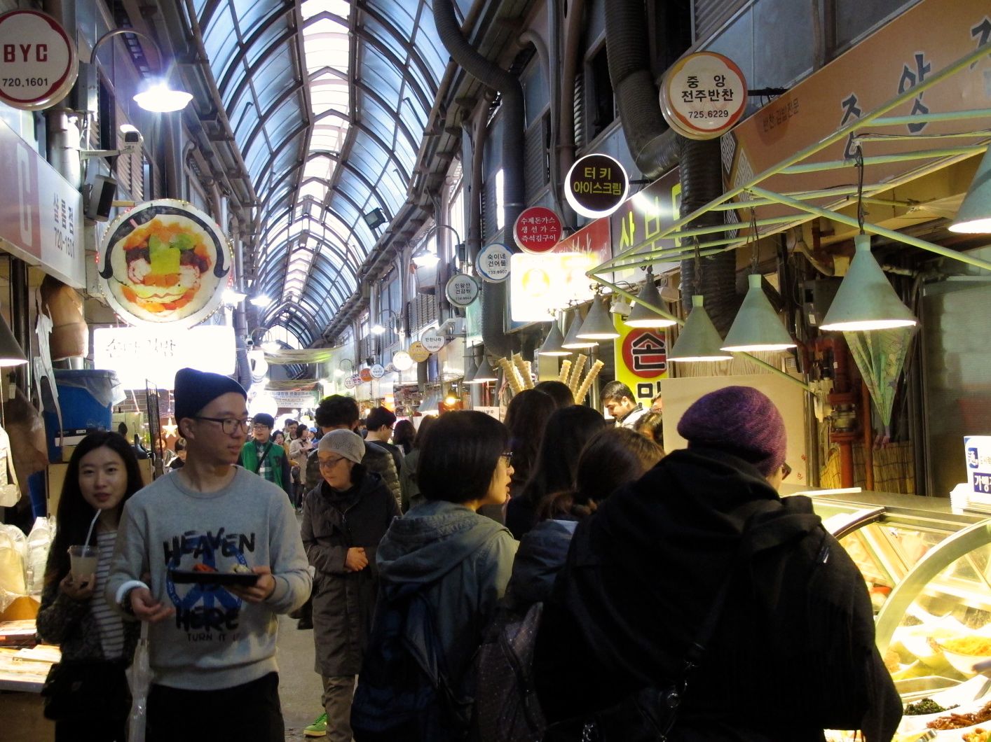 I thought the coolest edible experience of this trip was our visit to a toshirak (lunch box) market. In the photo above, you can see kimchijeon (kimchi pancakes), lots of steamed mandu (dumplings), and a jar of coins, which are not actual South Korean currency — instead they’re just little tokens that you pay for, along with an empty bento-style container; then you use them to “buy” items to put in your lunch box along the market street.