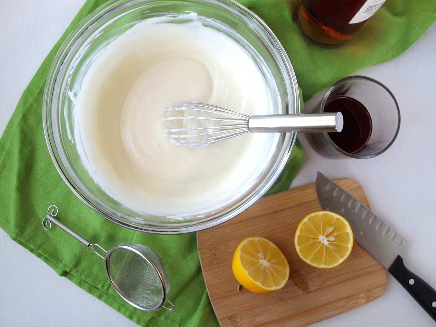 1. In a medium bowl, whisk together the yogurt, sugar, and salt, until the sugar and salt have dissolved in the yogurt.