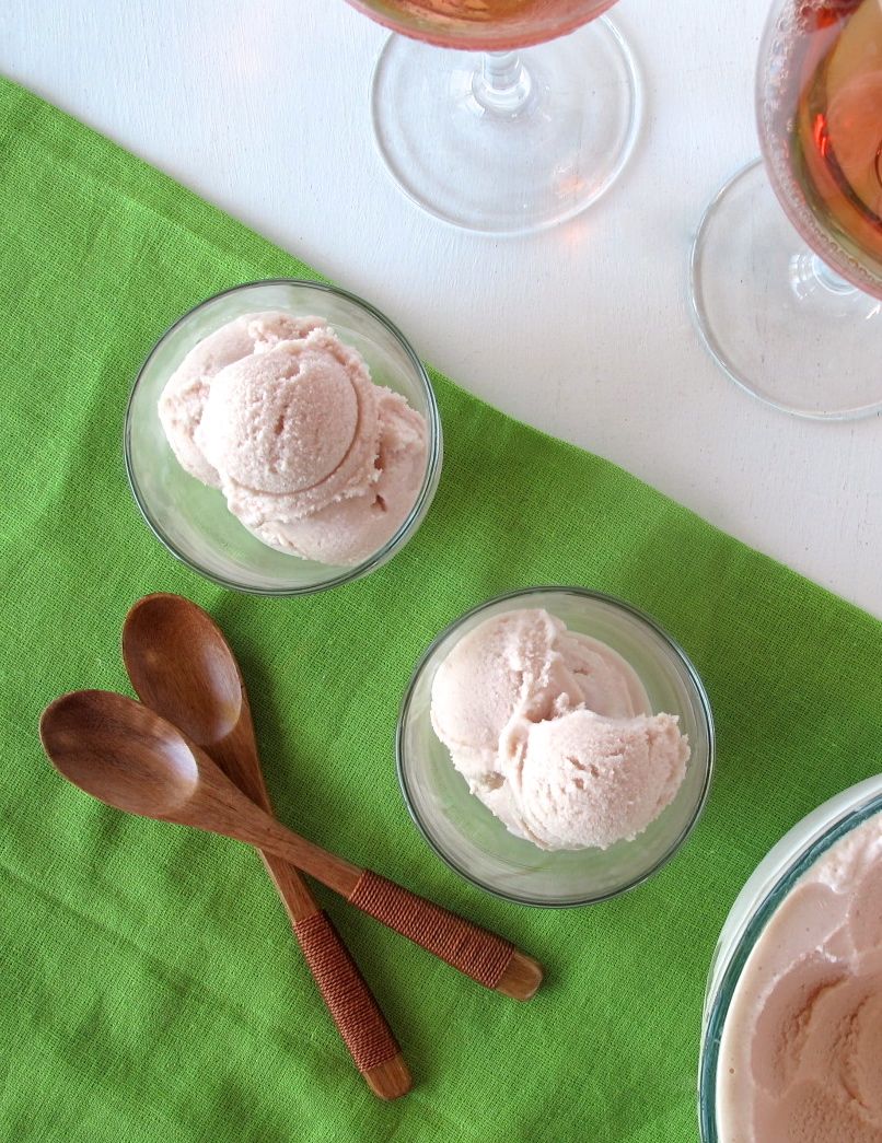 Note: The alcohol in the rosé will prevent it from freezing 100% while churning: when you transfer it to a container, there may still be about 2 tablespoons of unfrozen liquid, but once stored in the freezer, the entire batch will freeze to a nice soft-serve consistency.
